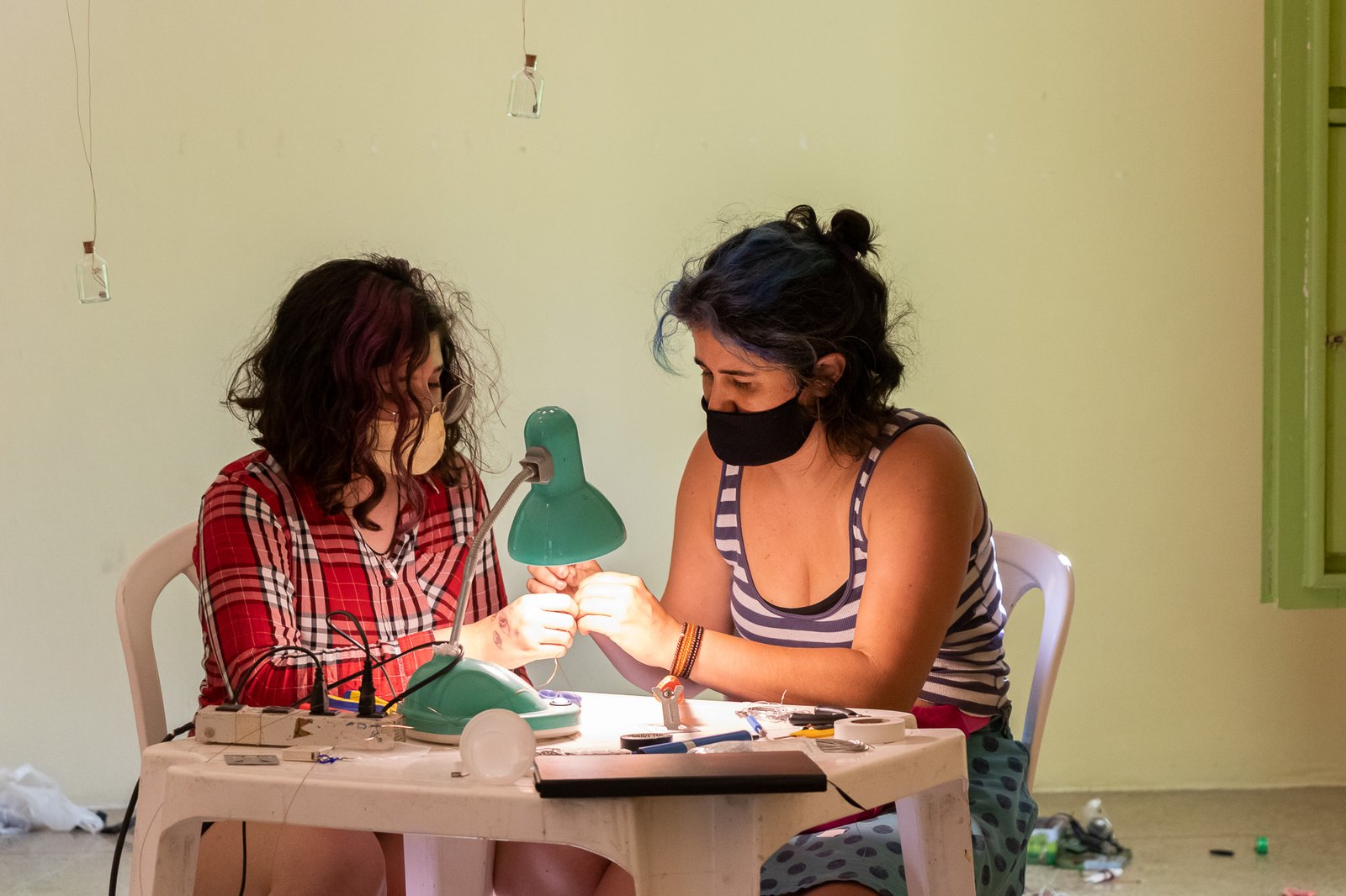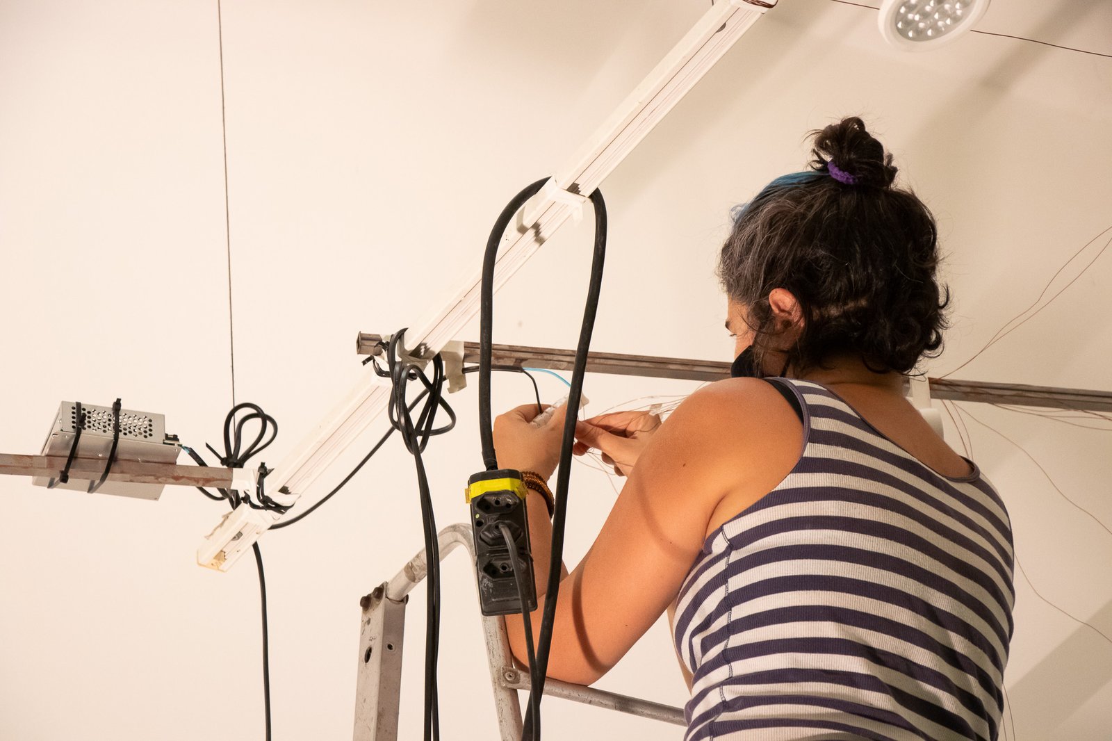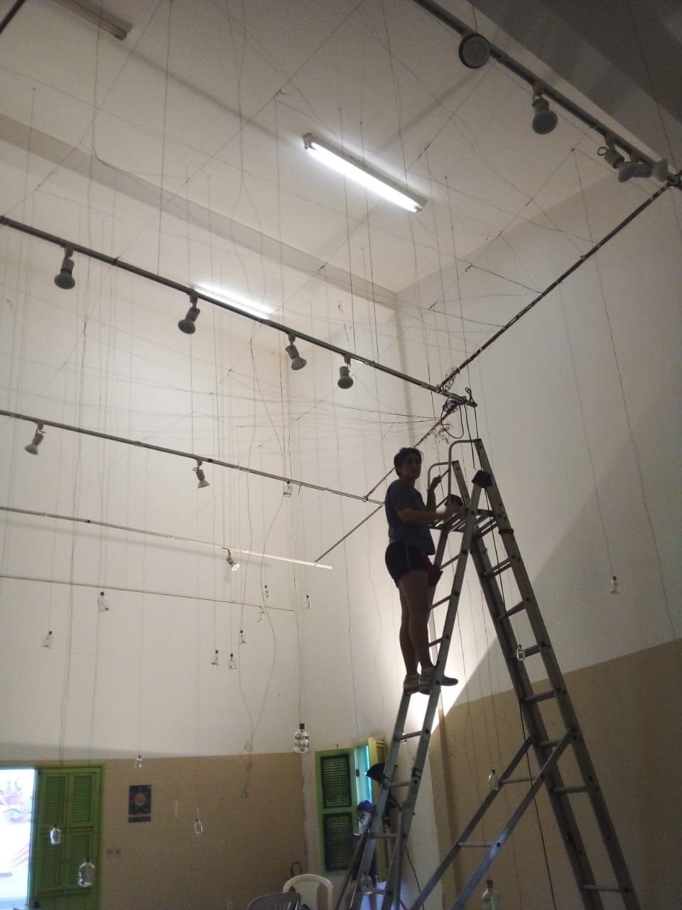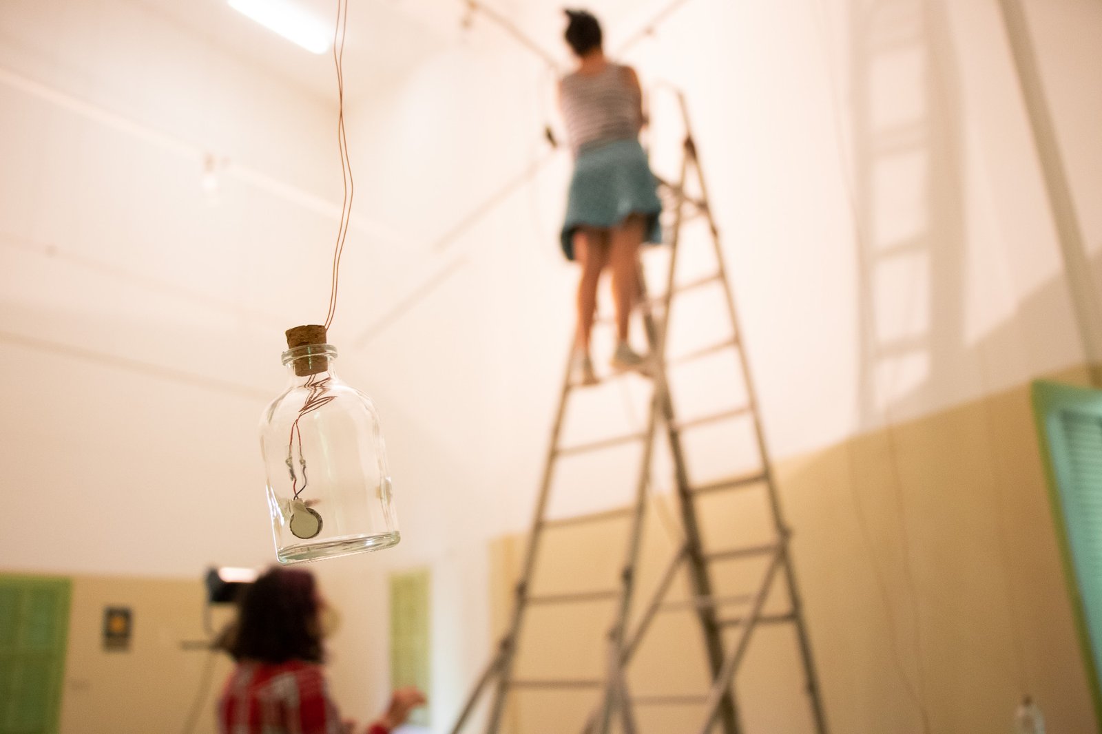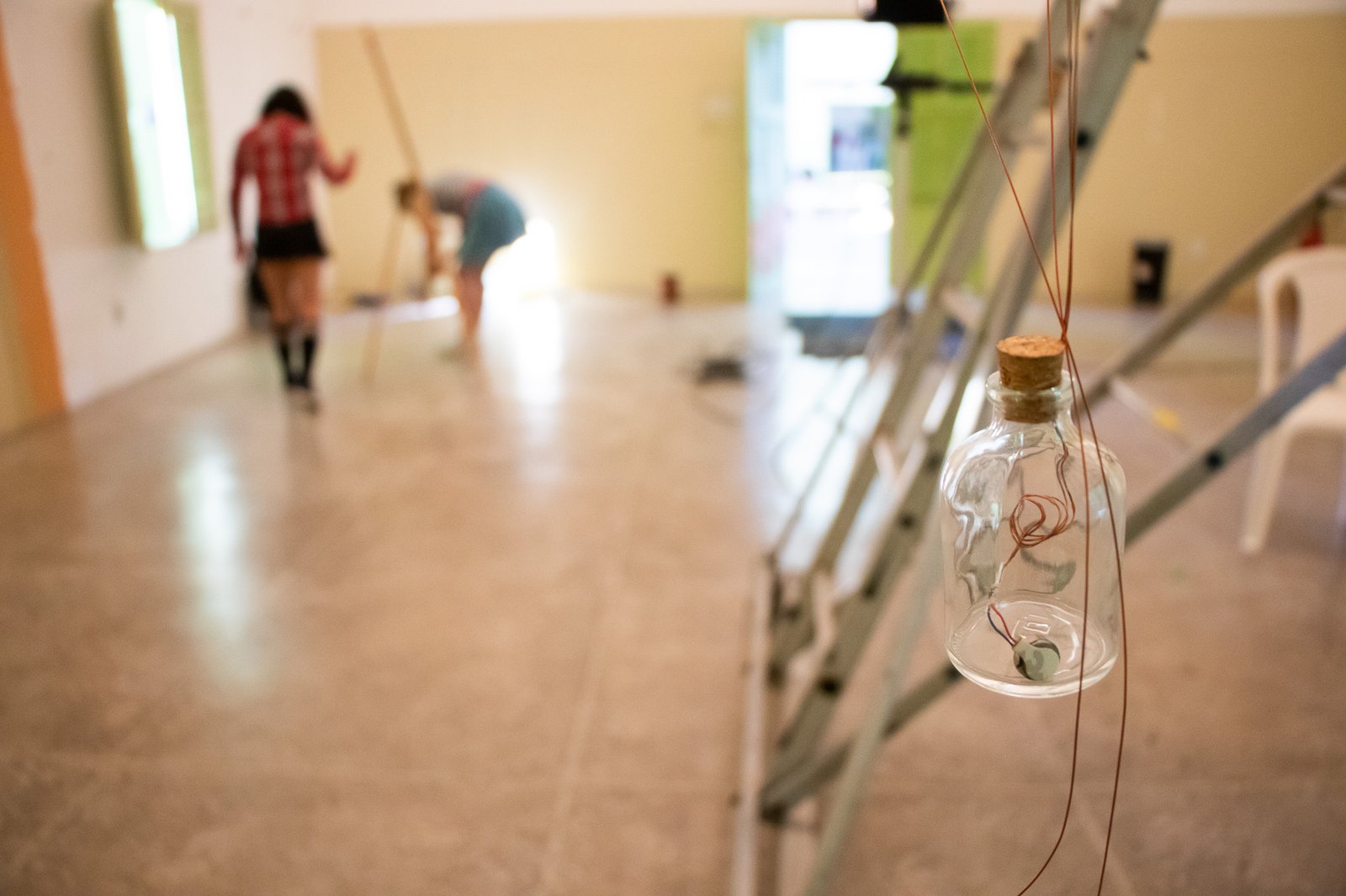 Nessa instalação, o próprio processo de construção é lugar de outras lutas: disputar e questionar o sentido do uso da automatização tecnológica; disputar a existência de mulheres no âmbito da tecnologia; acessibilizar idéias/ferramentas em conversas e outras ações formativas; atuar no fortalecimento dos processos da periferia… lutas contidas nesse gesto de distribuir uma multiplicidade de motores víbrios em vidros tilitintando no espaço.