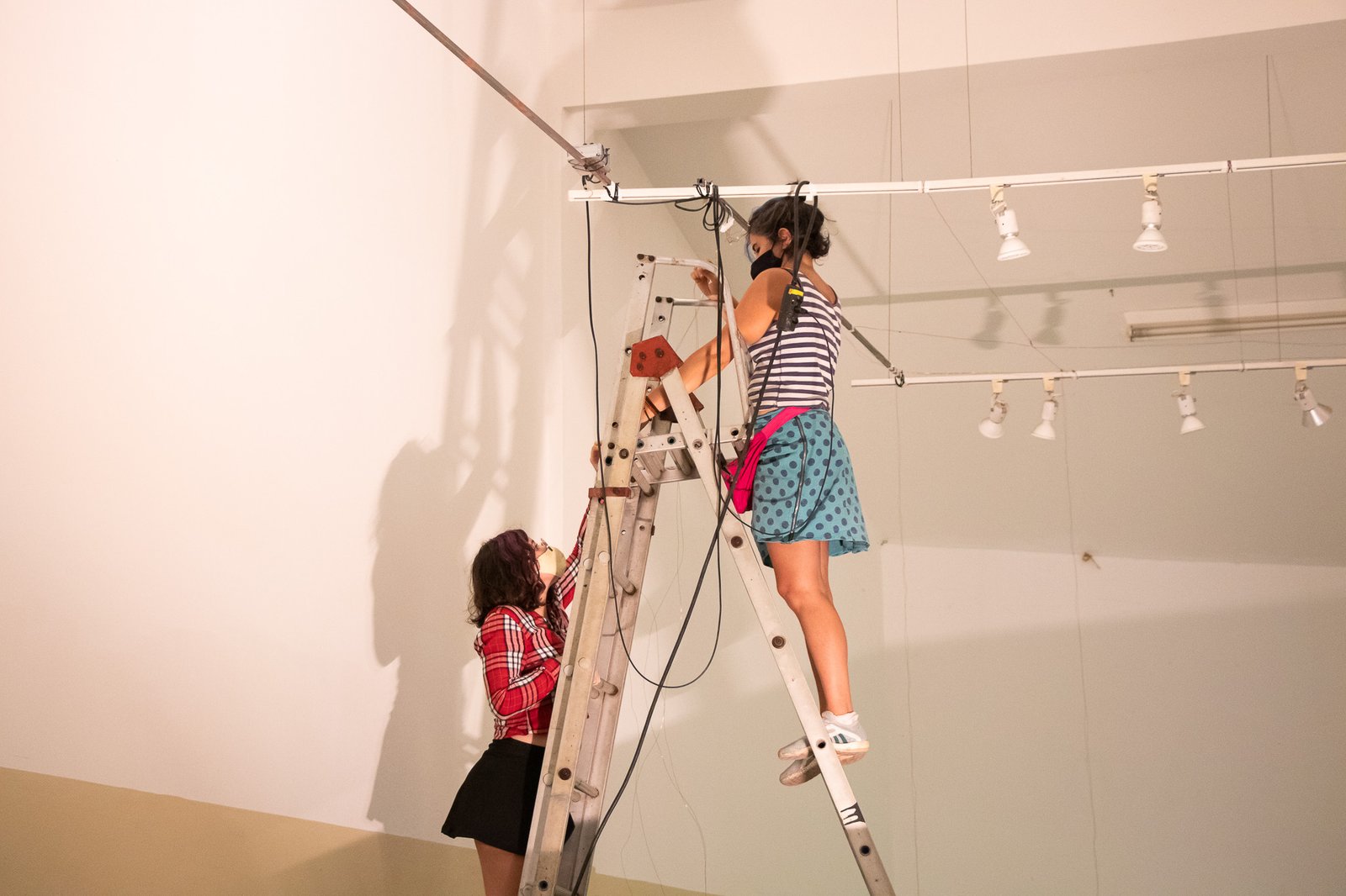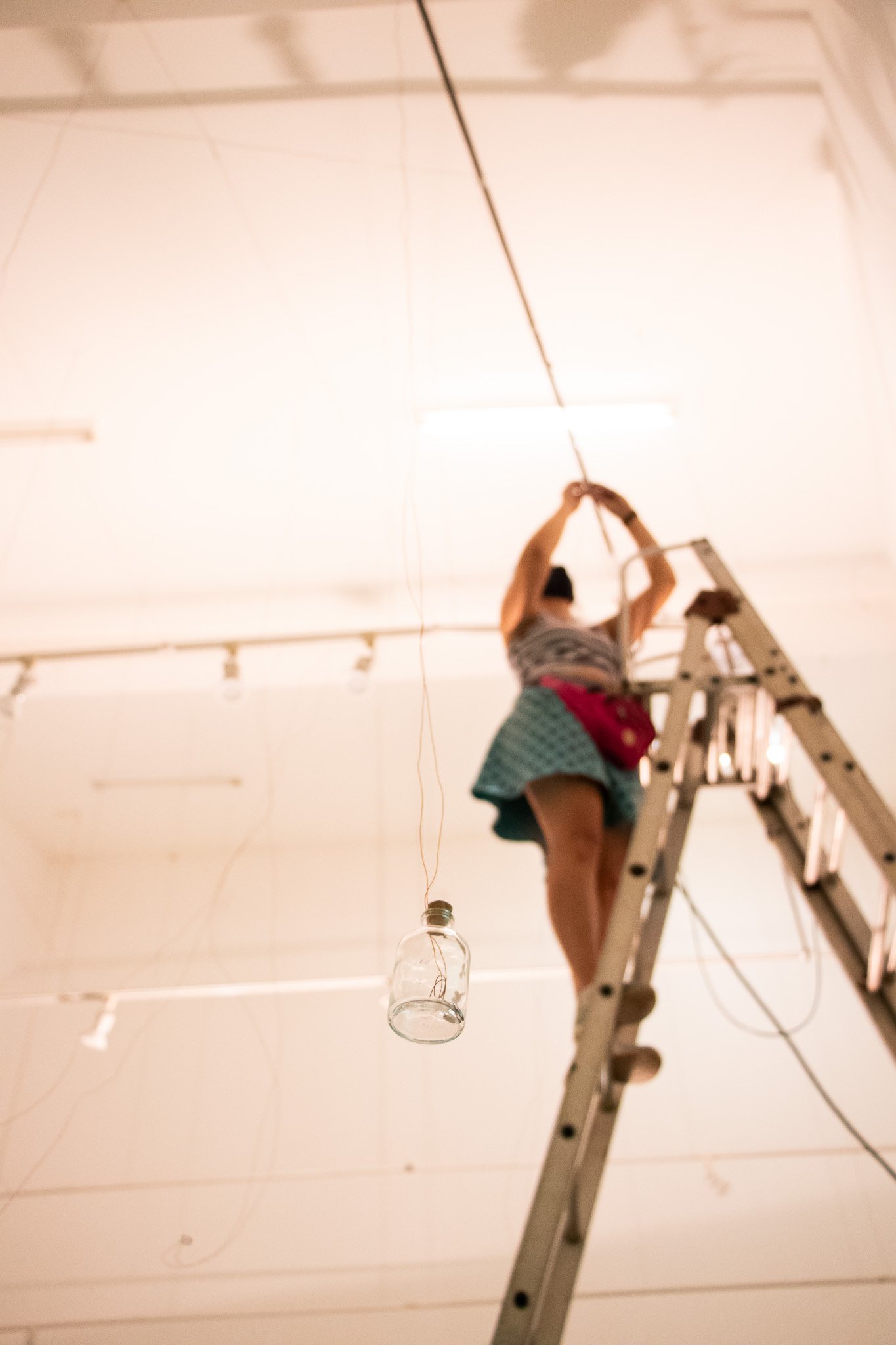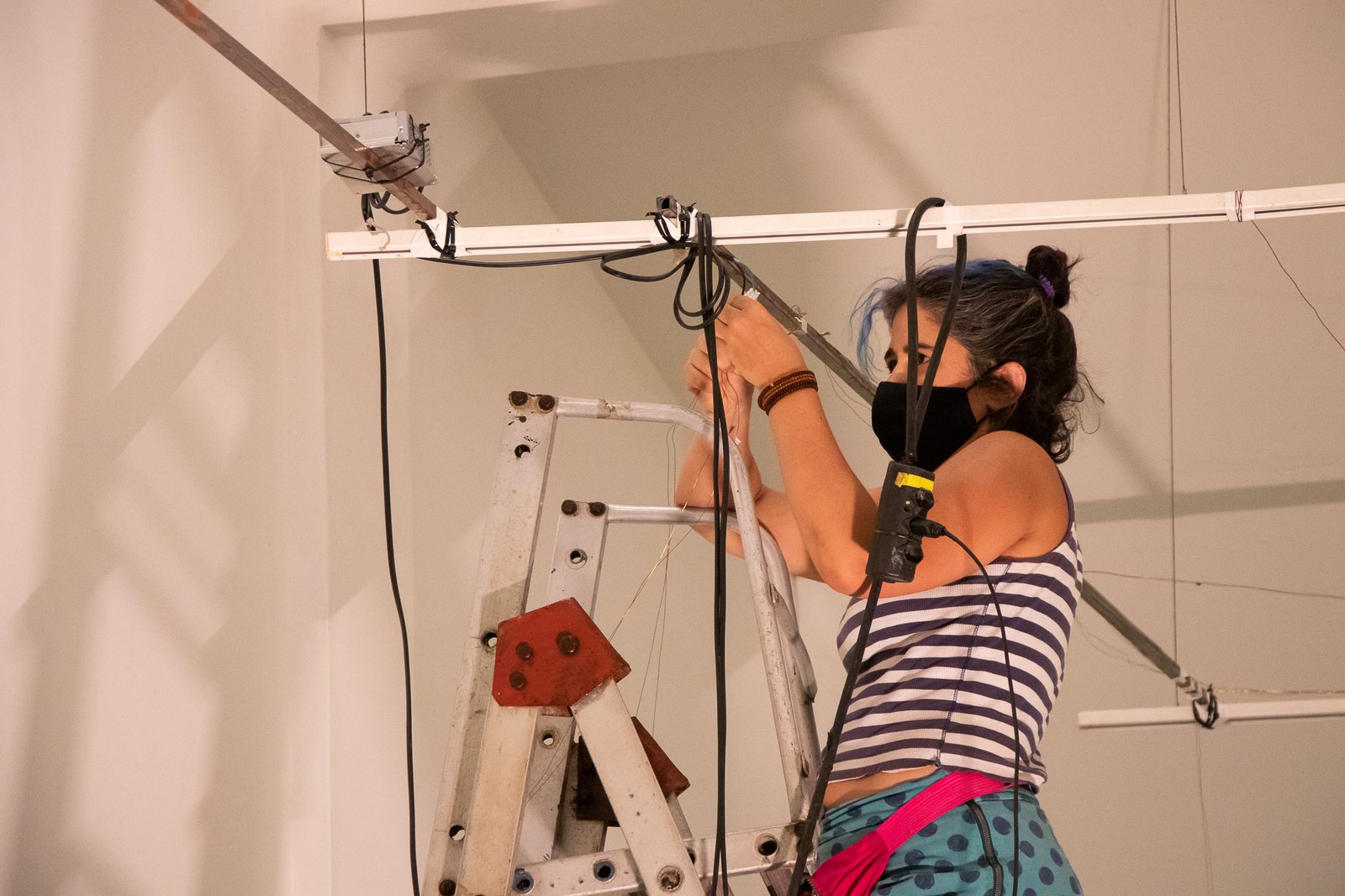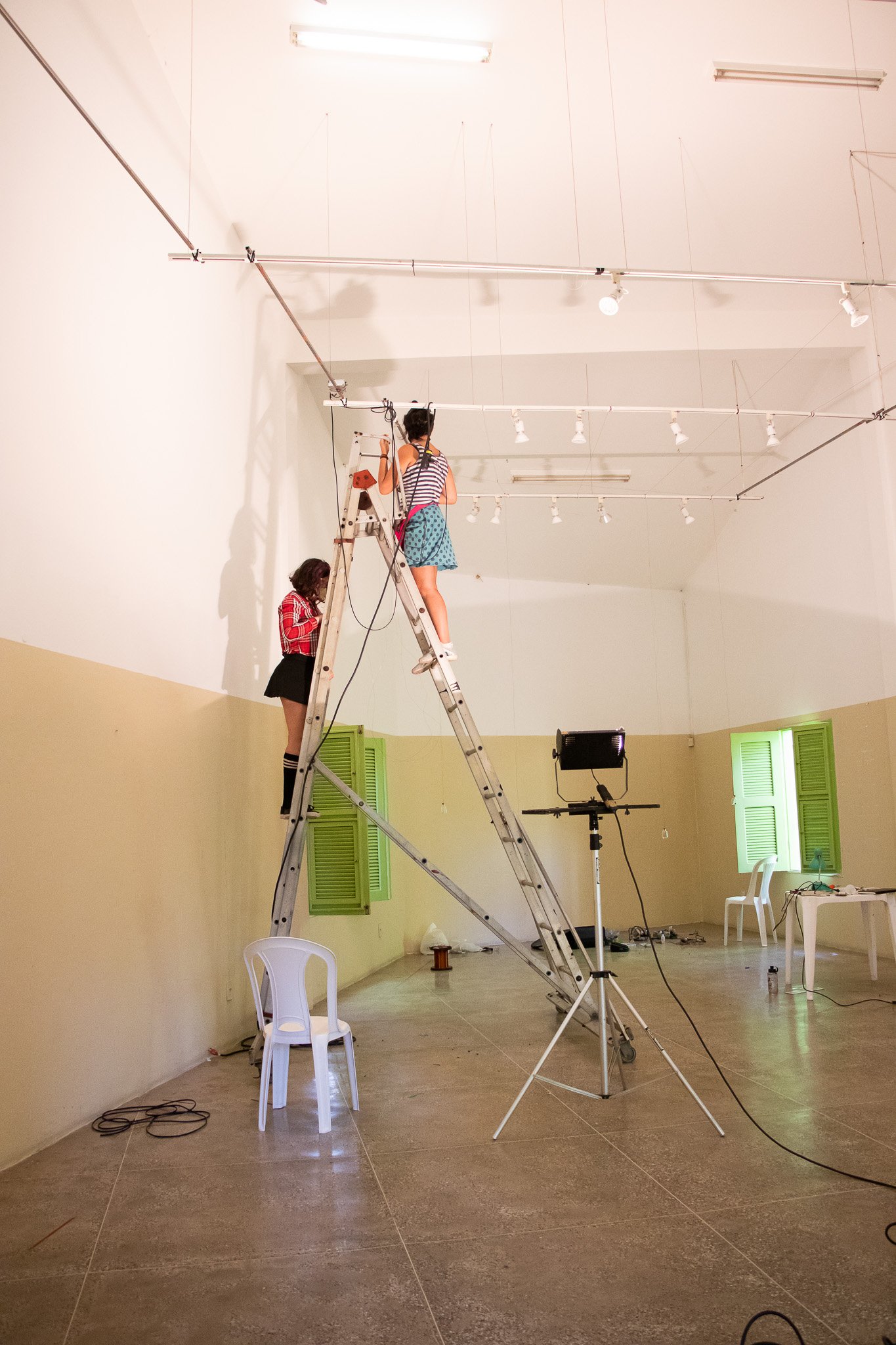 Nessa instalação, o próprio processo de construção é lugar de outras lutas: disputar e questionar o sentido do uso da automatização tecnológica; disputar a existência de mulheres no âmbito da tecnologia; acessibilizar idéias/ferramentas em conversas e outras ações formativas; atuar no fortalecimento dos processos da periferia… lutas contidas nesse gesto de distribuir uma multiplicidade de motores víbrios em vidros tilitintando no espaço.