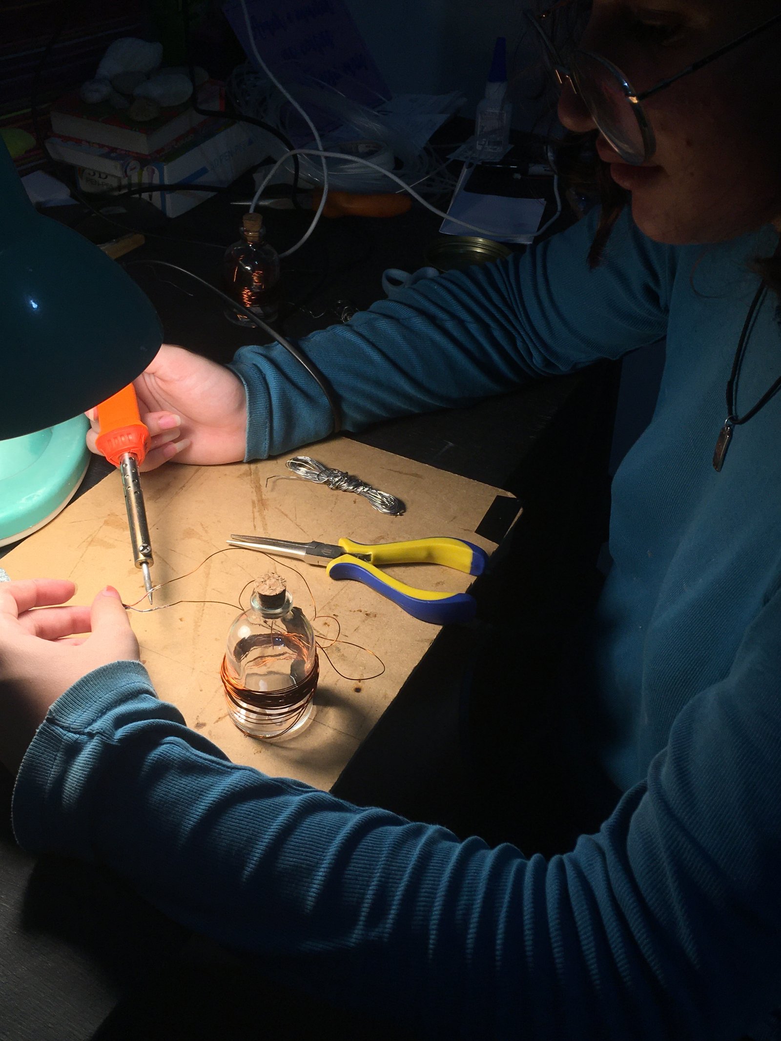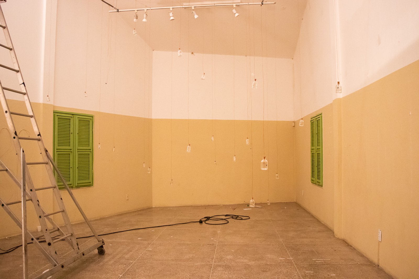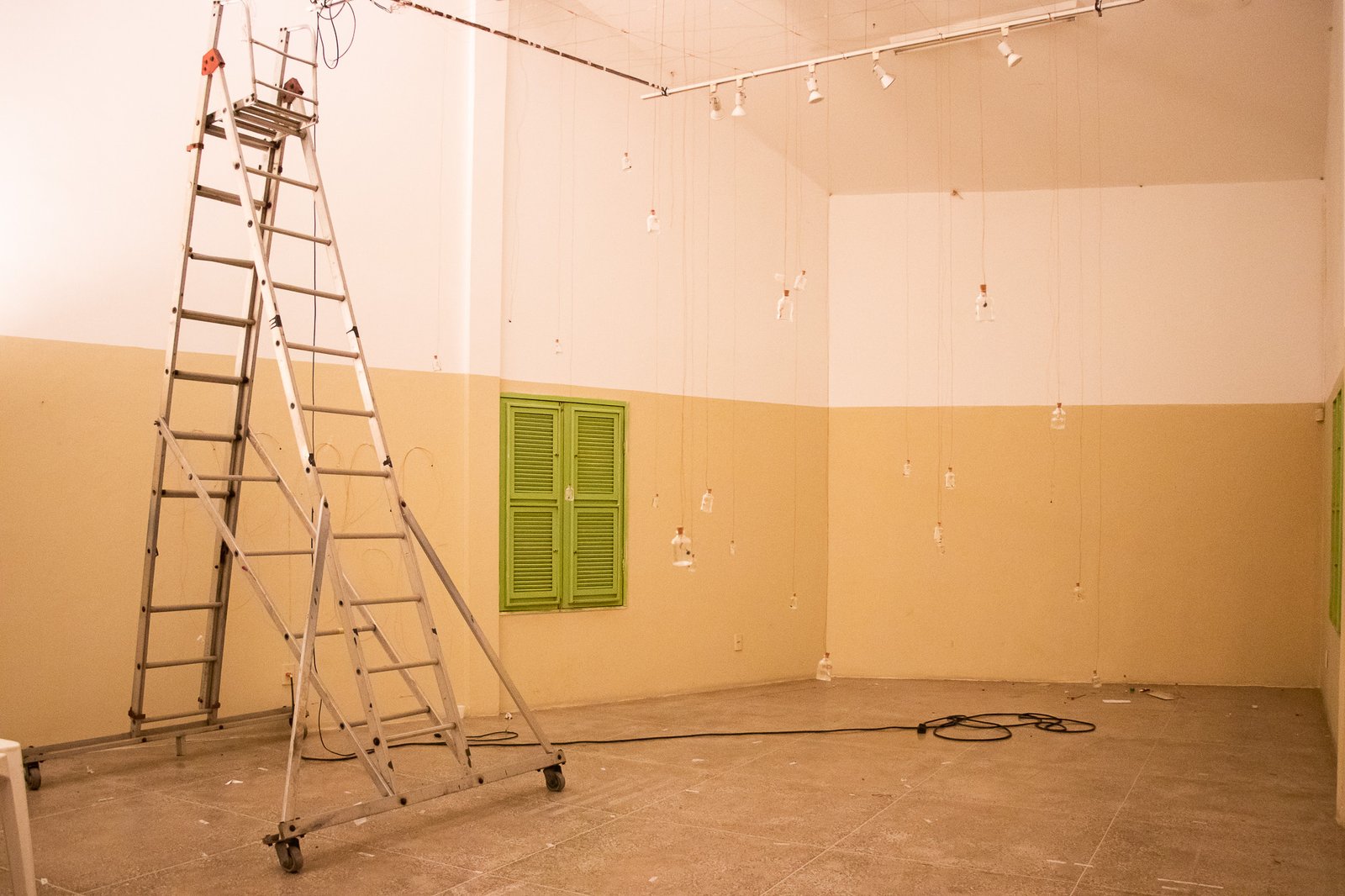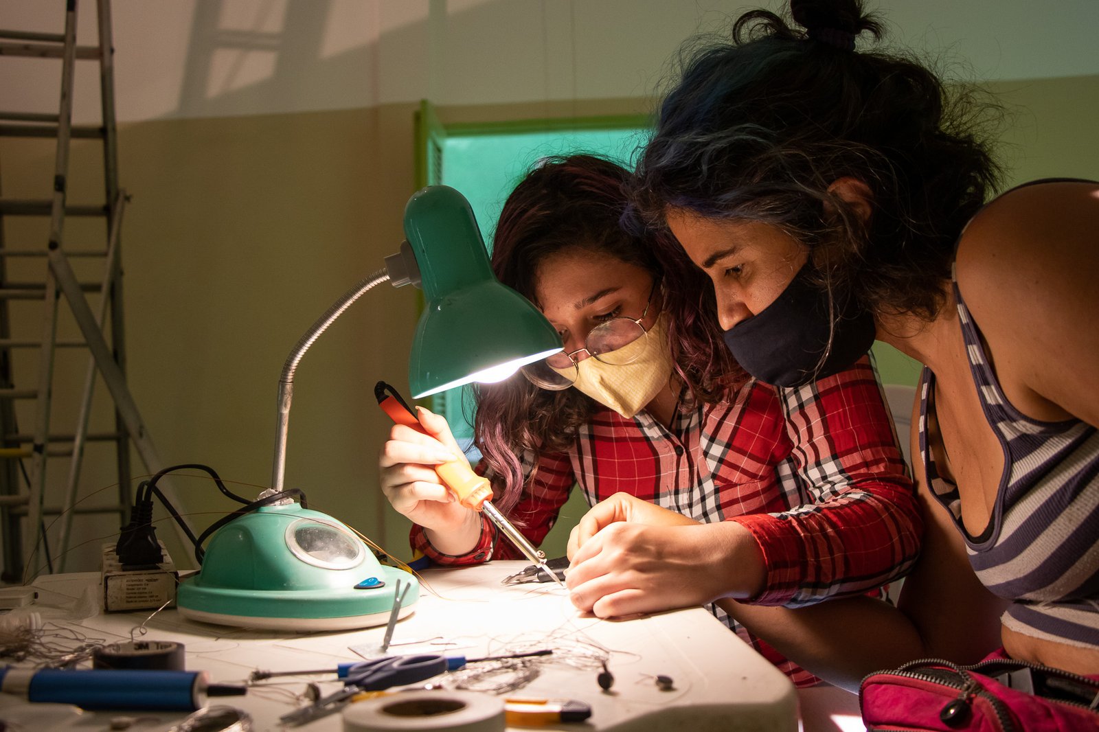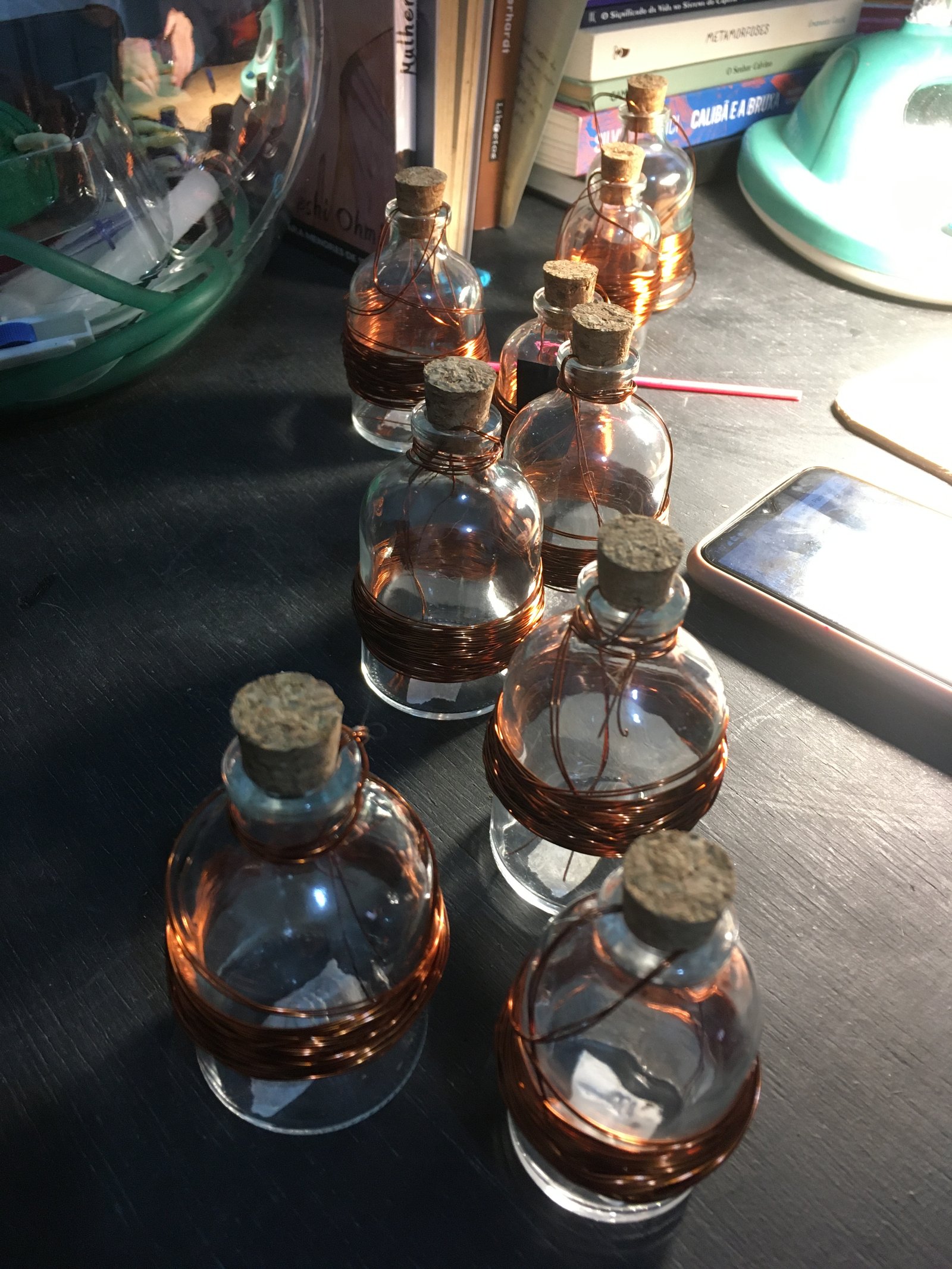 Nessa instalação, o próprio processo de construção é lugar de outras lutas: disputar e questionar o sentido do uso da automatização tecnológica; disputar a existência de mulheres no âmbito da tecnologia; acessibilizar idéias/ferramentas em conversas e outras ações formativas; atuar no fortalecimento dos processos da periferia… lutas contidas nesse gesto de distribuir uma multiplicidade de motores víbrios em vidros tilitintando no espaço.