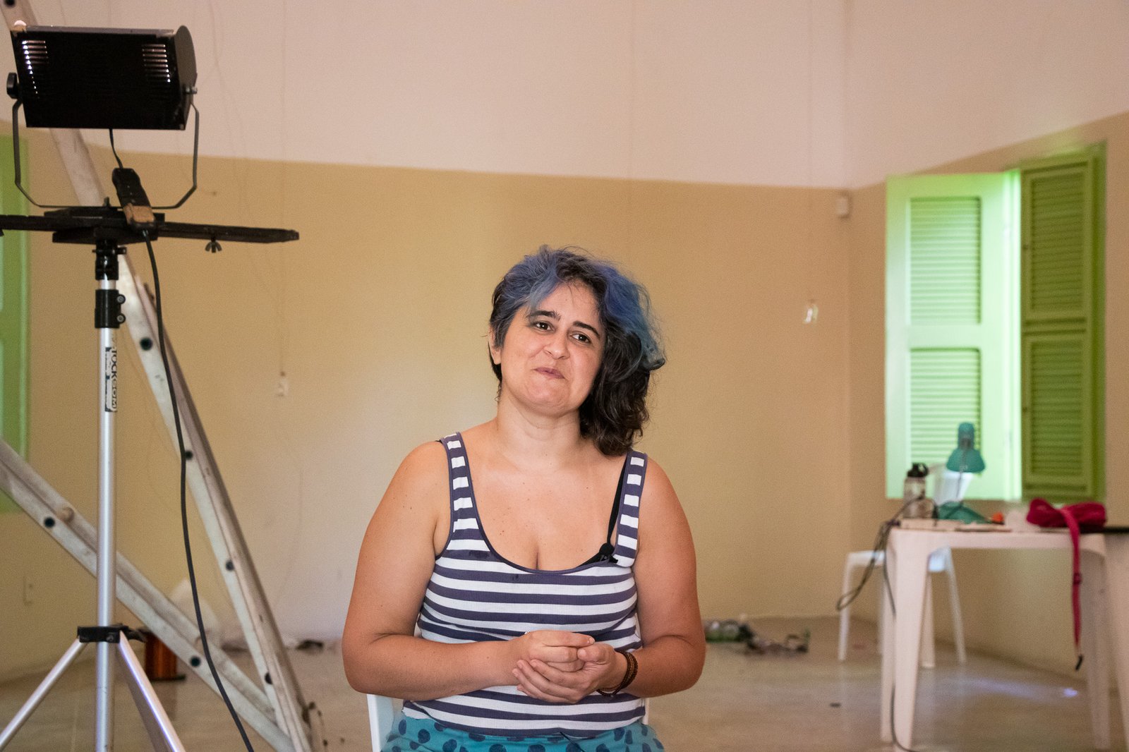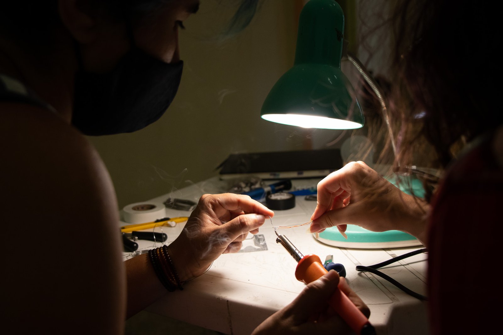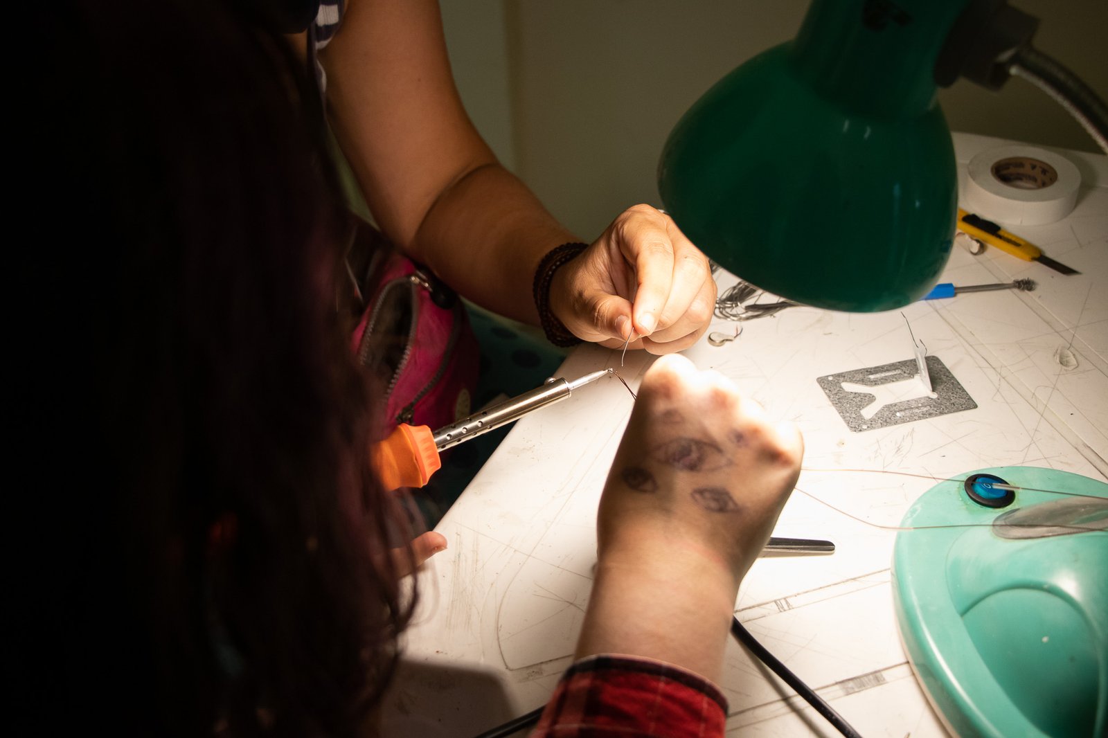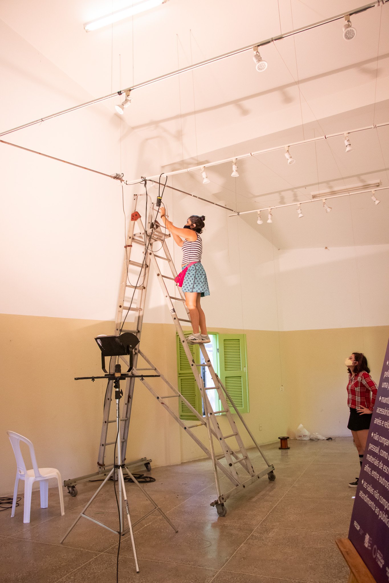 Nessa instalação, o próprio processo de construção é lugar de outras lutas: disputar e questionar o sentido do uso da automatização tecnológica; disputar a existência de mulheres no âmbito da tecnologia; acessibilizar idéias/ferramentas em conversas e outras ações formativas; atuar no fortalecimento dos processos da periferia… lutas contidas nesse gesto de distribuir uma multiplicidade de motores víbrios em vidros tilitintando no espaço.
